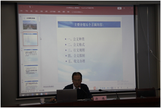 為進(jìn)一步提升公司員工公文寫(xiě)作和處理能力,促進(jìn)公司公文處理工作實(shí)現(xiàn)規(guī)范化、標(biāo)準(zhǔn)化。11月22日,在公司12樓會(huì)議室組織開(kāi)展了公文處理專(zhuān)題培訓(xùn),集團(tuán)公司全體干部職工、子公司主要負(fù)責(zé)人60余人參加了培訓(xùn)。培訓(xùn)邀請(qǐng)市政府辦副調(diào)研員許偉同志進(jìn)行授課。