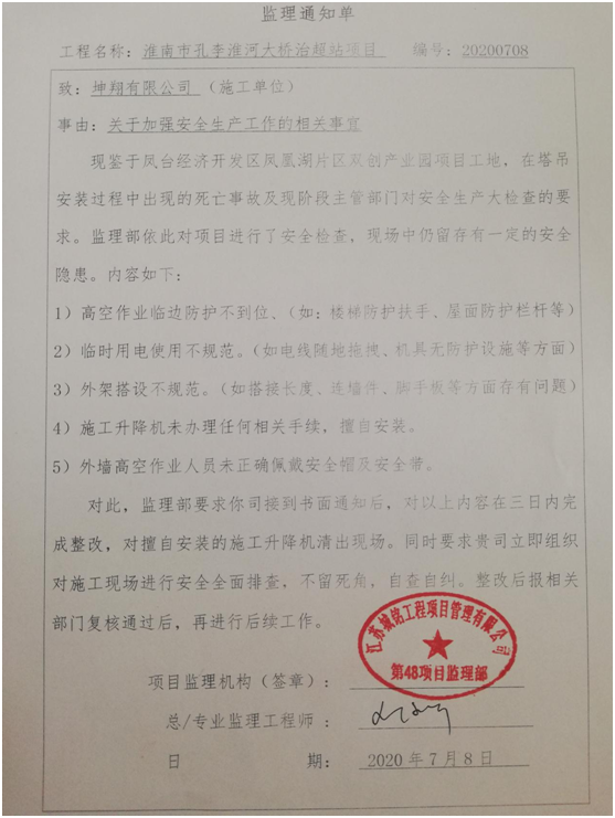 7月7日,集團(tuán)公司總經(jīng)理宋道河帶領(lǐng)公司相關(guān)部門人員對正在建設(shè)的孔李淮河大橋治超站進(jìn)行了專項安全檢查。宋總首先聽取了項目施工單位安全工作匯報,隨后又深入施工現(xiàn)場對安全工作進(jìn)行實地檢查,檢查中發(fā)現(xiàn)部分施工人員未佩帶安全帽安全帶、樓梯扶手不牢固、接地窗戶無安全護(hù)欄、升降梯未安裝安全門等安全隱患。檢查結(jié)束后宋總現(xiàn)場要求施工單立即整改并要求項目管理部及監(jiān)理單位加強(qiáng)安全管理工作。監(jiān)理單位按照檢查情況向項目施工單位下達(dá)了監(jiān)理通知書,要求施工單位限期整改并開展項目建設(shè)安全工作自查自糾。次日,施工單位已按7月7日檢查要求及監(jiān)理通知單對項目安全隱患進(jìn)行了整改。