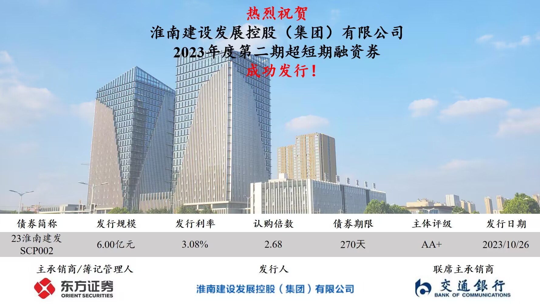 10月26日,“淮南建設(shè)發(fā)展控股(集團(tuán))有限公司2023年度第二期超短期融資券”成功簿記發(fā)行,發(fā)行規(guī)模6億元,全場(chǎng)認(rèn)購(gòu)倍數(shù)2.68倍,票面利率3.08%。較近三月來(lái),同品種、同期限、同評(píng)級(jí)債券平均利率3.25%下降0.17%。